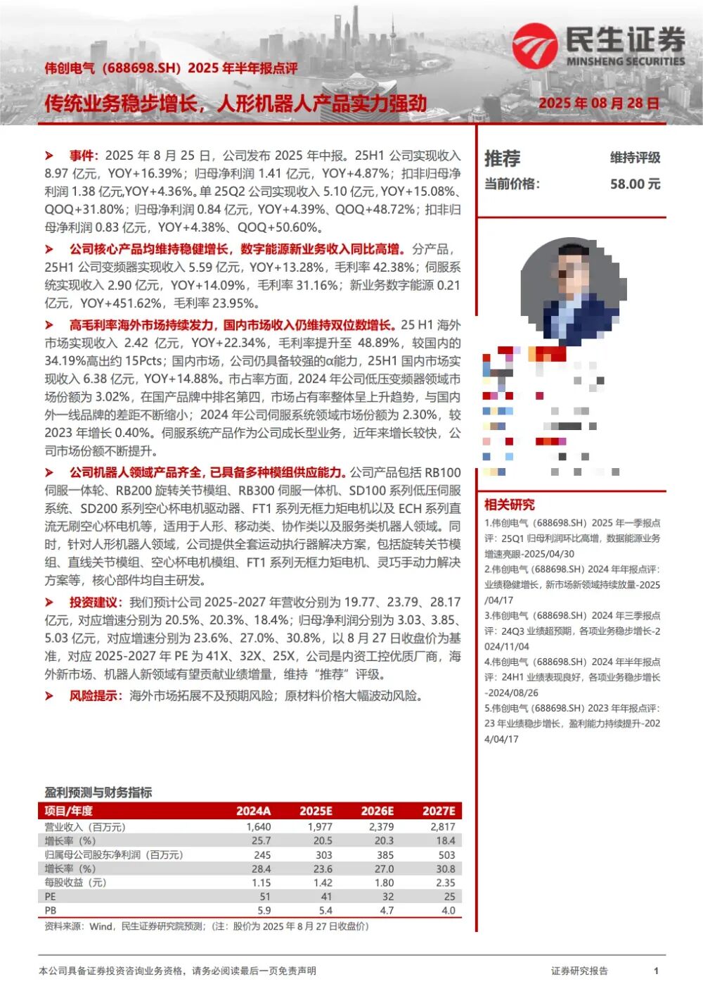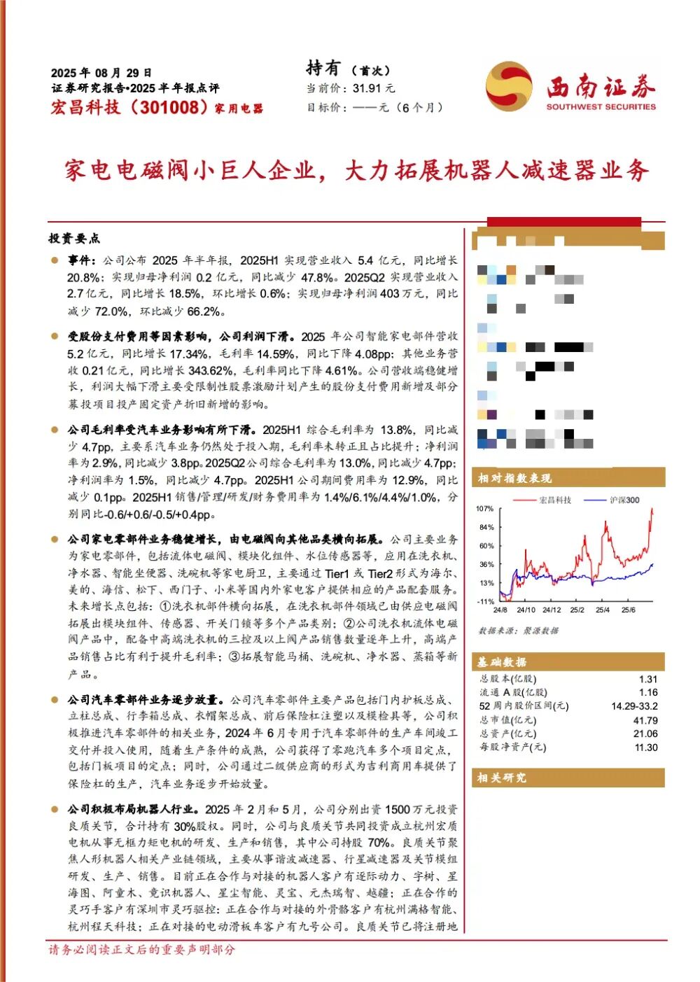 家电零部件业务为公司主要业务,主要产品以电磁阀为技术核心向其他产品进行技术延伸,形成以电磁阀、微型电机、电子水泵为技术包向下游客户提供相适应的产品品类,核心产品为电磁阀、模块组件、水位传感器、开关门锁等,最终用在智能洗衣机、智能马桶、洗碗机、净水器、蒸箱等白色家电上。目前,洗衣机贡献的收入占比约为70%;智能马桶的收入占比约为10%。受益于国补政策,下游客户的动销影响较为明显,上半年营业收入保持两位数增长,在手订单比较饱满。净利润同比出现下滑,主要原因是部分募投项目投入使用折旧增加、股份支付费用增加及主要原材料涨价等原因。目前公司已启动期货套期保值工作,通过锁定铜的采购成本,稳定产品毛利率,并加大采购降本、研发降本、管理降本等措施,力争提升净利率水平。