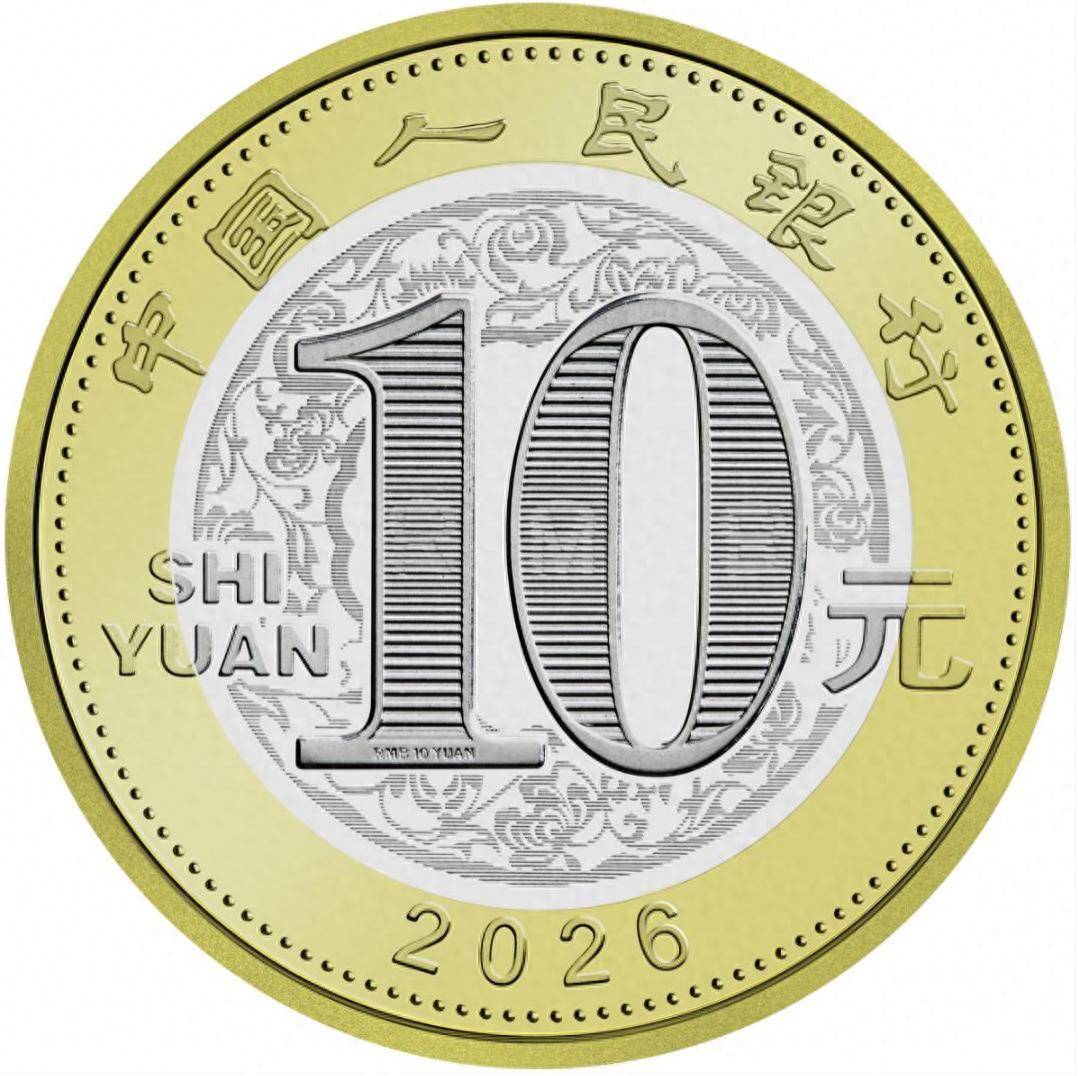 双色铜合金纪念币正面图案为“中国人民银行”、“10元”字样,汉语拼音字母“SHIYUAN”及年号“2026”,底纹衬以团花图案。